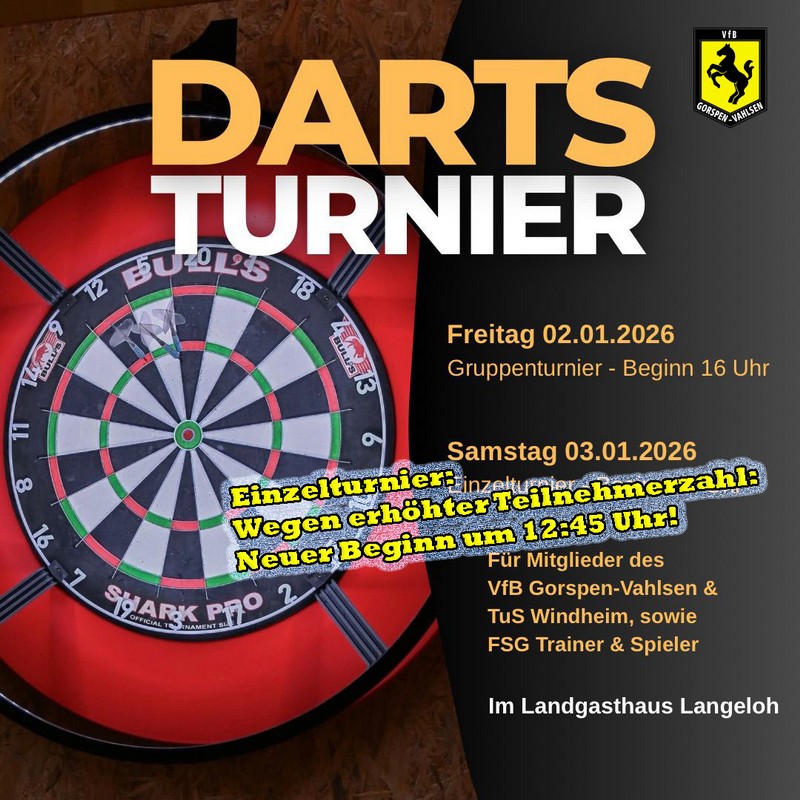 Unser 3. Dartturnier für Mitglieder des VfB Gorspen-Vahlsen, des TuS Windheim sowie Spieler und Trainer der FSG steht bevor – zwei Tage voller Spannung, Spaß und guter Laune warten auf euch!