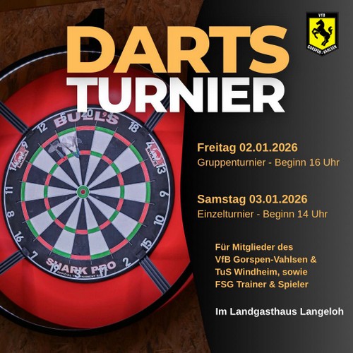 Unser 3. Dartturnier für Mitglieder des VfB Gorspen-Vahlsen, des TuS Windheim sowie Spieler und Trainer der FSG steht bevor – zwei Tage voller Spannung, Spaß und guter Laune warten auf euch!